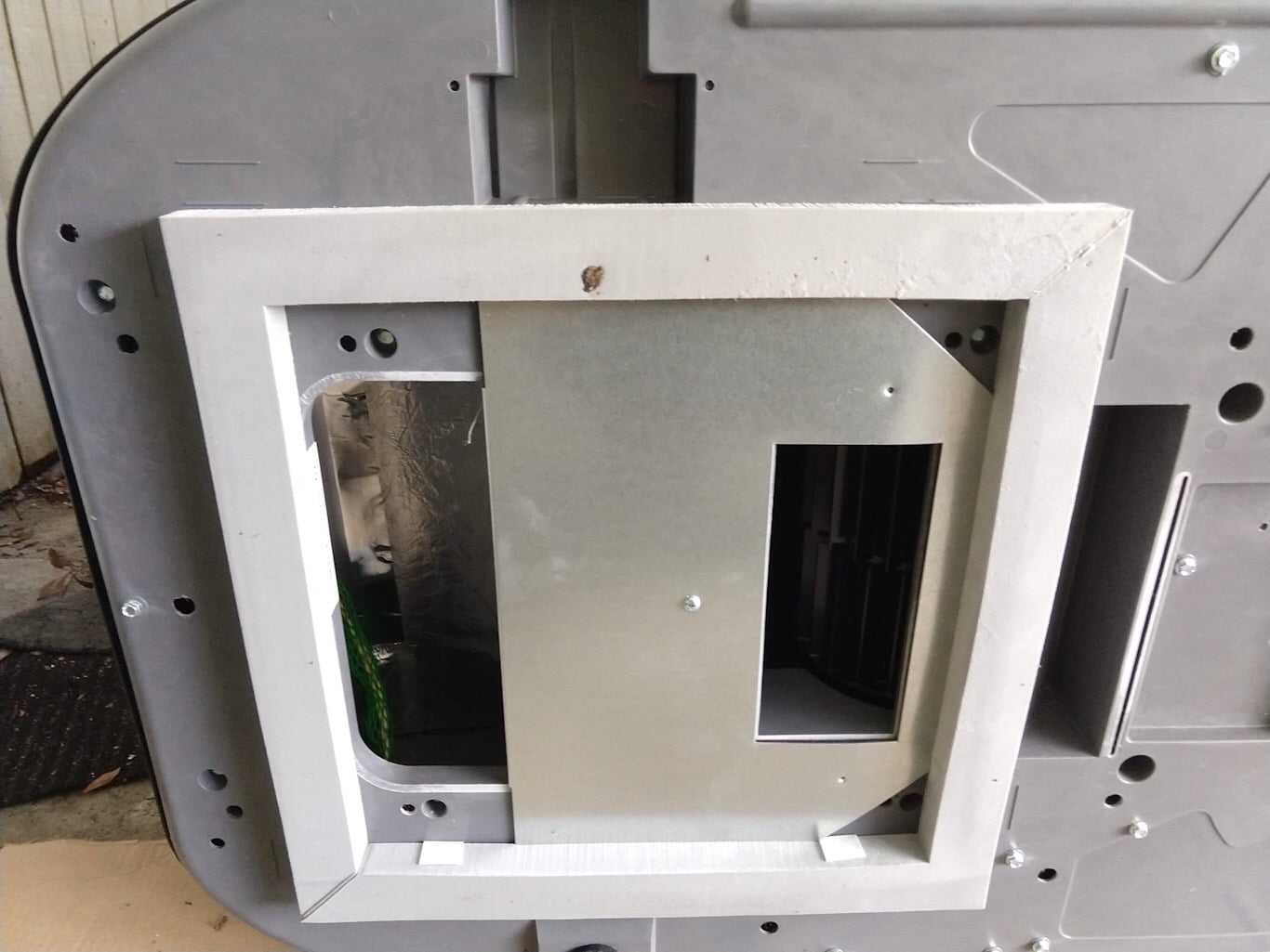 Measure twice, cut once. You’ll need a 14″ x 14″ opening in the roof to install the AC unit. I measured from the inside of the van as it was easier to figure out the exact position in relation to the structural beams in the roof.